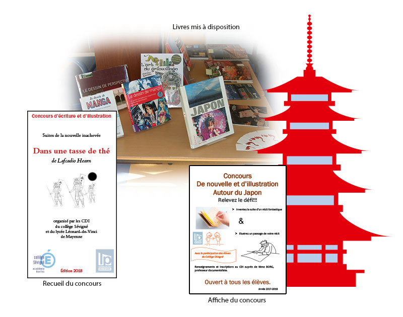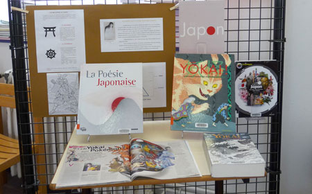 Les participants ont eu l’occasion de visiter une exposition sur le Japon (panneaux d’information, ouvrages) afin d’aider à la compréhension du texte et à l’écriture de la suite. Elle a été élaborée par Mme Borg à partir des thématiques développées dans le récit de Lafcadio Hearn : la vie des samouraïs, les croyances religieuses au XVIIe siècle, le rituel de cérémonie du thé, l’imaginaire fantastique japonais… Une partie de la documentation a été prêtée par les médiathèques partenaires du lycée et du collège.